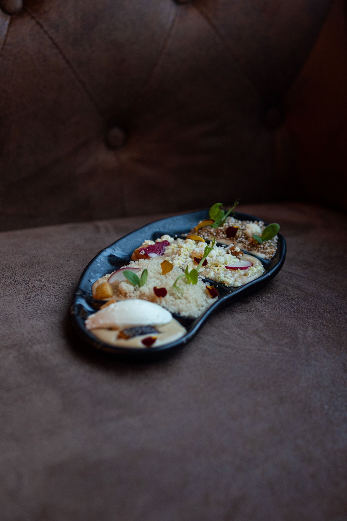“Esparragá” , perdiz escabechada ,sorbete de granada y vinagre de padrón.