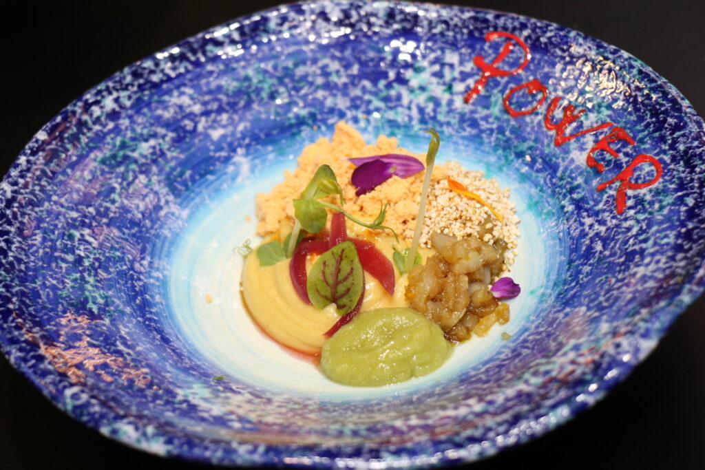 El segundo sería un Espárrago «Esparragaó», elaborado con con una crema de espárrago con mantequilla noisette, maíz caramelizado ácido/picante, yema de huevo, espuma de «esparragaó», y yema de espárragos al natural.