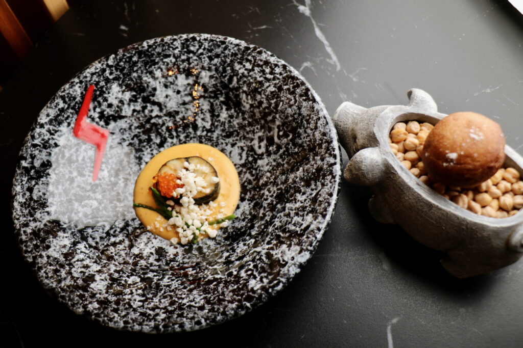 Con la Selección de panes artesanos que normalmente se acompaña con una gran selección de AOVE se serviría en esta ocasión el aceite La Heredera, creado por Bodegas Gancedo con sus olivos cultivados en ecológico en El Bierzo. También servido con Mantequilla Calaveruela de ajillo.
