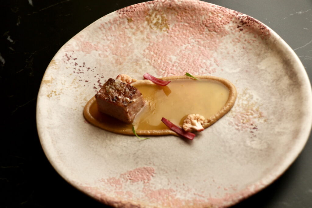 Samuel seguiría con un Mosaico de lubina Aquanaria, botillo y espárrago, fusionando técnicas japonesas y el mayor representante de la cocina berciana. Para estos dos últimos platos se sirvió el vino Herencia del Capricho 2022.