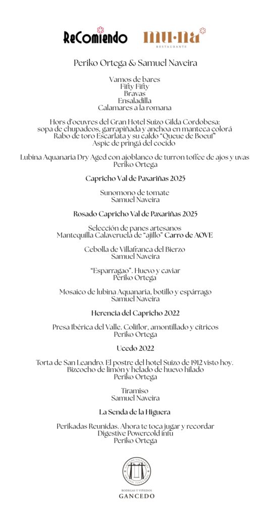 El menú creado por ambos chefs contemplaba algunos de los platos de la nueva temporada de ambos restaurantes lo que supuso un aliciente más a esta deseada cena. Todos los vinos servidos en la cena serían de Bodegas y Viñedos Gancedo