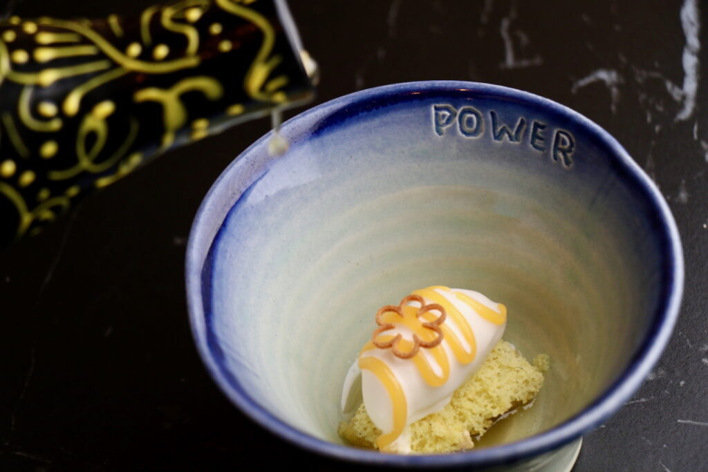 Los postres comenzaban con Torta de San Leandro. El postre del hotel Suizo de 1912 visto hoy. Bizcocho de limón y helado de huevo hilado, creado por Periko Ortega.